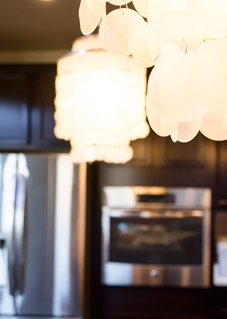 I love our new kitchen, too! We didn't like the builder grade pendant light selection, so I ordered capiz shell pendant lights and a dining room chandelier to match that looks both a bit oceanside and glamorous. Both are from Home Depot.